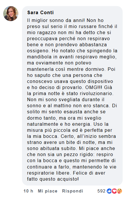 In pochi secondi, si adatta alla bocca, si adatta alla mascella e ti permette di respirare liberamente per tutta la notte, per un sonno profondo, tranquillo e davvero ristoratore.